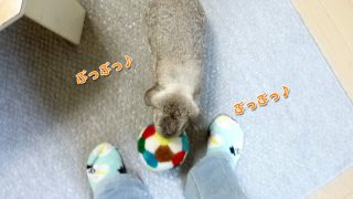 たるちは、大好きなボールちゃんと仲良くしているので、もしかしたら、足にも興味を示すかも?
