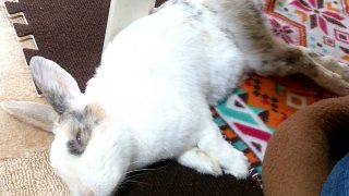 カーペットから遠ざかると、諦めたうさぎ(ぷーすけは、床に出られません)。