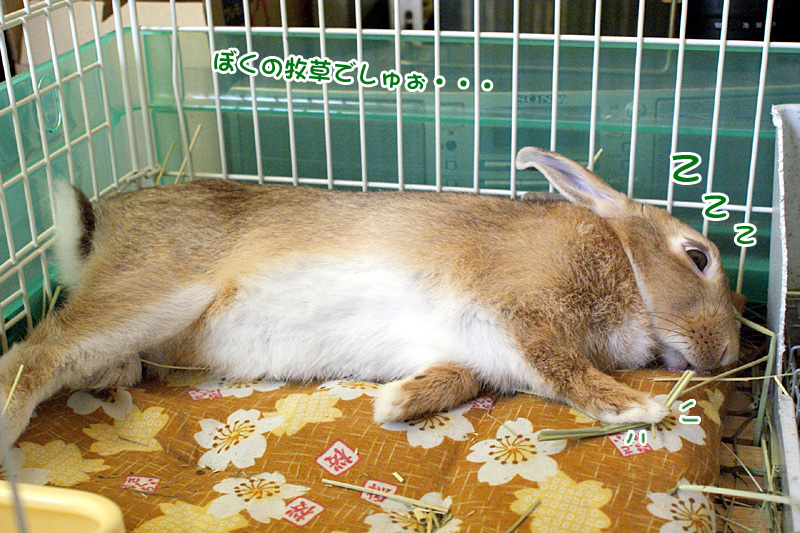 牧草を押さえて寝てる~(たまたまだよ、たまたま)