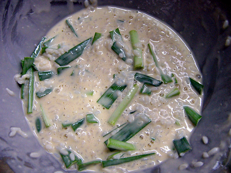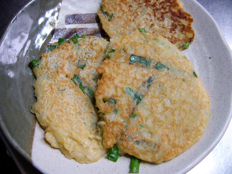 冷ご飯(大き目のお茶碗)1杯、小麦粉、、水、ニラ1/3束、卵1コ