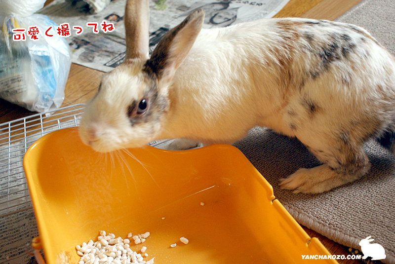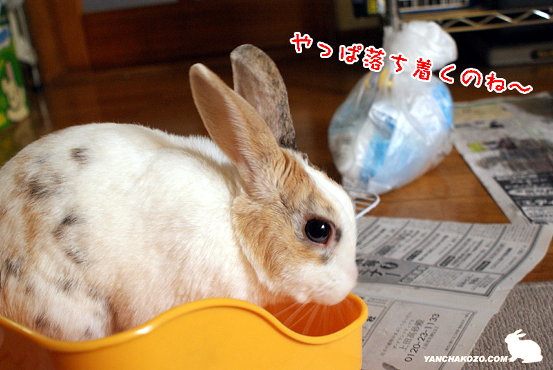 新聞紙の上でお座りをしてるうさぎさんが1うさ