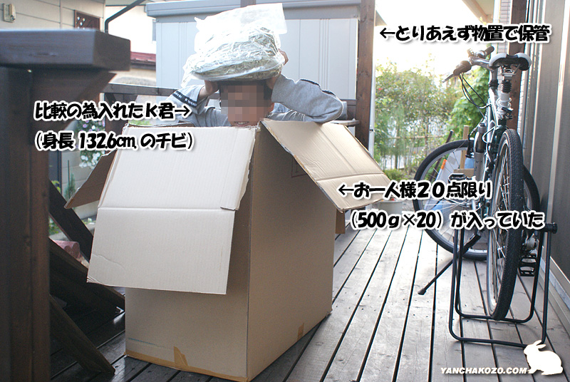 500g×20袋を物置に保管しようと、外でダンボールを開けた